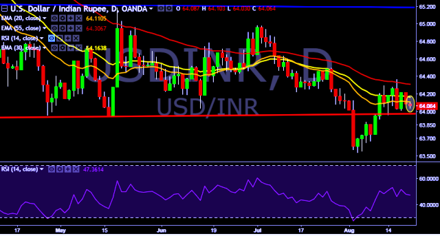 We prefer to take short position in USD/INR only below 64.00, stop loss at 64.25 and target of 63.75.