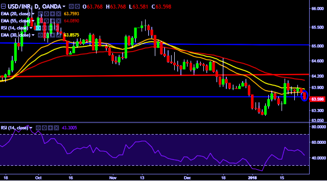 We prefer to take short position in USD/INR around 63.65, stop loss at 63.87 and target of 63.47/63.28.