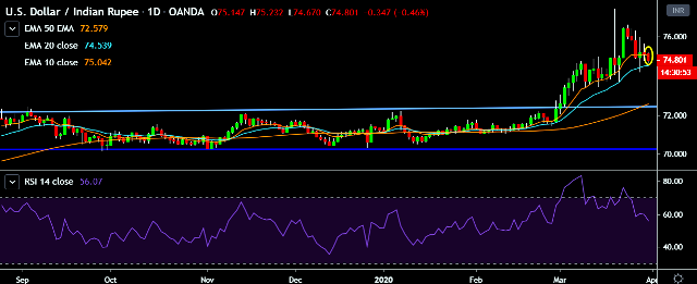 - USD/INR is currently trading around 74.80 marks.