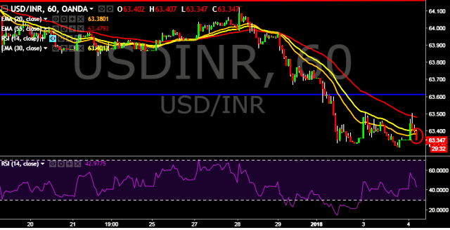 We prefer to take short position in USD/INR around 63.37, stop loss at 63.55 and target of 63.12/62.48.