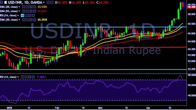 We prefer to take short position in USD/INR only below 66.20, stop loss at 66.60 and target of 65.75.