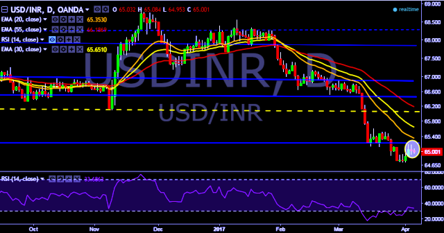 - USD/INR is currently trading around 65.01 marks.