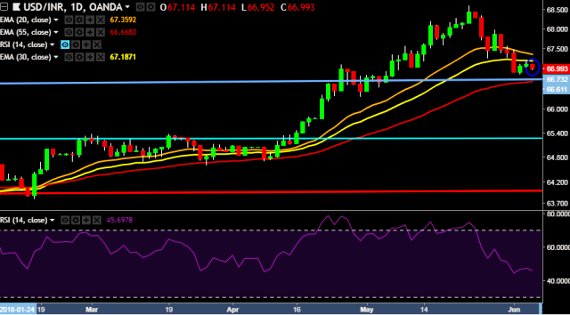 - Key resistances are seen at 67.11, 67.34, 67.55, 67.97, 68.10, 68.50, 68.68, 68.83 and 68.98 marks respectively.