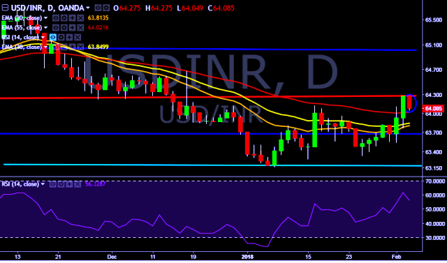 We prefer to take long position in USD/INR only above 64.27, stop loss at 64.02 and target of 64.58.