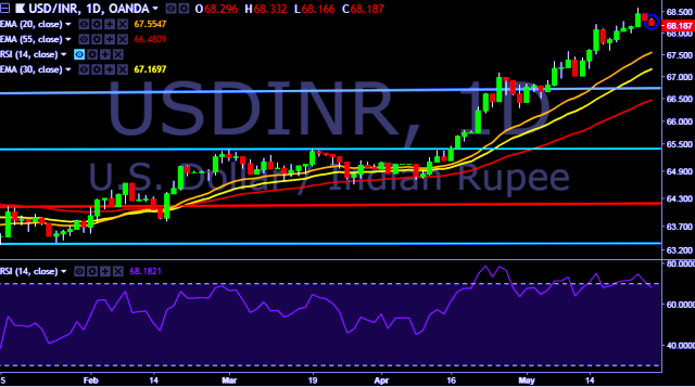 We prefer to take long position in USD/INR around 68.10, stop loss at 67.98 and target of 68.43/68.58.