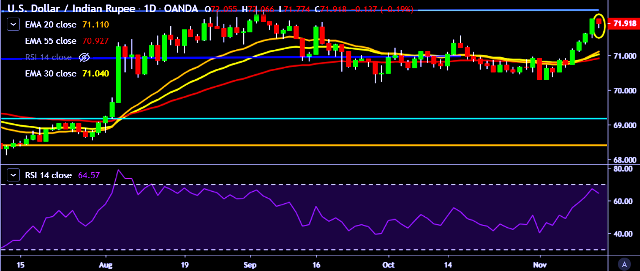 - USD/INR is currently trading around 71.90 marks.