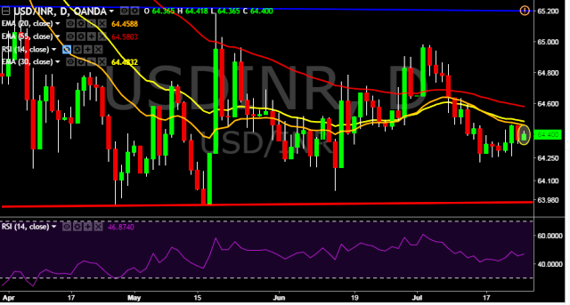 We prefer to take long position in USD/INR only above 64.45, stop loss at 64.32 and target of 64.75/64.82.