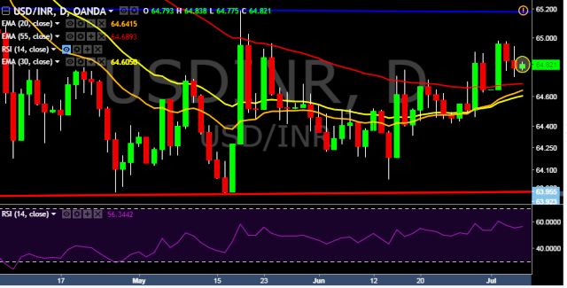 We prefer to take long position in USD/INR only above 64.98, stop loss at 64.70 and target of 65.18/65.25.