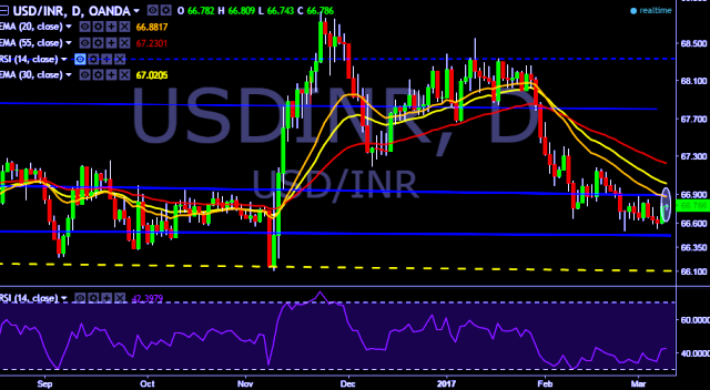 We prefer to take short position in USD/INR around 66.85, stop loss 67.00 and target of 66.55.