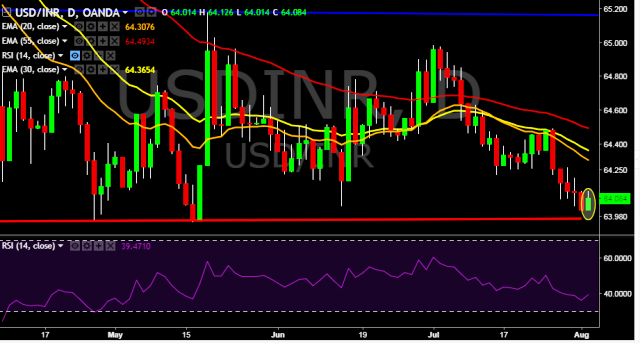 We prefer to take short position in USD/INR only below 64.01, stop loss at 64.25 and target of 63.65.