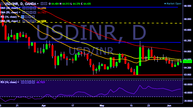 We prefer to take long position in USD/INR around 64.35, stop loss at 64.22 and target of 64.68.