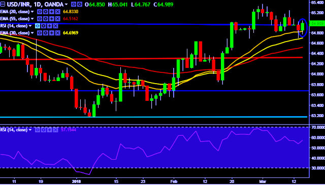 We prefer to take long position in USD/INR only above 65.10, stop loss at 64.82 and target of 65.48.
