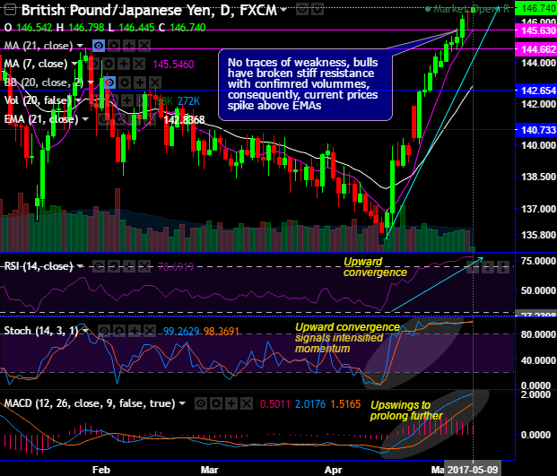 Although GBPJPY halted bull swings yesterday at 146.542 levels, after stern bullish candle with the big real body, the bulls resume rallies today despite a deceptive hanging man pattern, rallies likely to extend upon confirmation from both leading & lagging indicators for now.