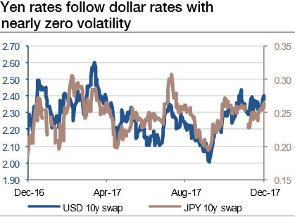 Since the Japanese central bank thrived in killing yen volatility, USDJPY has been a proxy of dollar rates. Japanese long-term rates are following US rates, but have shown almost zero volatility for a year now (refer above graph). USDJPY is thus coincidentally positively correlated with JPY rates.