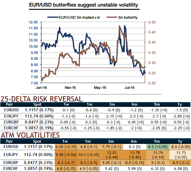On-going euro turbulence: The main risks events are now in Europe (ECB in September, Italian referendum, immigration tensions) and in the US (Jackson Hole, presidential election): this should support EUR/USD volatility.