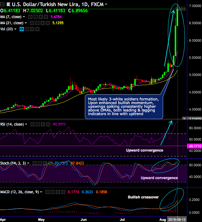 USDTRY is spiking and establishing swiftly new all-time highs day-by-day owing to a robust dollar outlook and new sanctions imposed on Turkey’s government. The pair has started bouncing from the lows of 5.2161 level to the recent highs of 7.0250 levels (refer daily technical chart). The bullish streaks have continued today as well. The lira continues its freefall despite Erdogan’s attempts to buoy the economy.