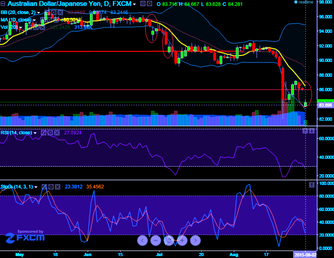 On AUDJPY daily chart, a gap down opening is occurred at 83.716 and leading RSI oscillator is stepping down below 30 levels, while %D crossover around 40 levels bolstering selling pressures. But this gap down should be confirmed with volumes as well. In order to analyze the downtrend, there were few other gaps occurred earlier as well at 93.565 and 91.177 levels. So it is quite difficult to assess whether the current gap is breakaway or run away gap as there is no proper volume confirmation.