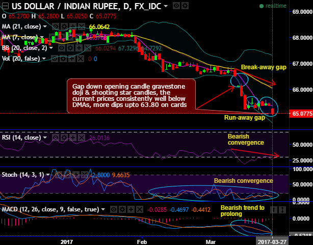 After break-away, run away gap at 65.2700 levels (refer daily charts): Gap down opening candle gravestone doji & shooting star candles, the current prices consistently well below DMAs, more dips upto 63.80 on cards.