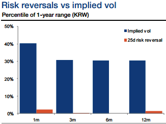 The KRW implied vol (1m to 1y) is in the middle of the 1-year range whereas 25-delta risk reversals are at the very bottom end.