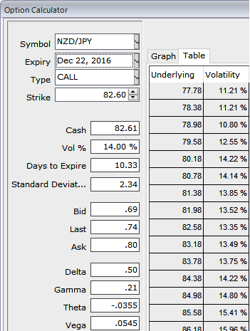 For an instance, as you could see the sensitivity tool for 2w NZDJPY ATM call, the Vega of a long (buy) option position is JPY 674 and if IV increases or decreases by 1%, the option’s premium would increase or decrease by JPY 674, respectively.