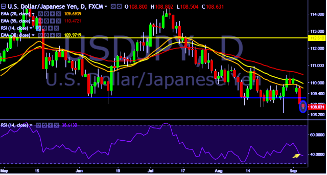 - USD/JPY is currently trading around 108.65 marks.