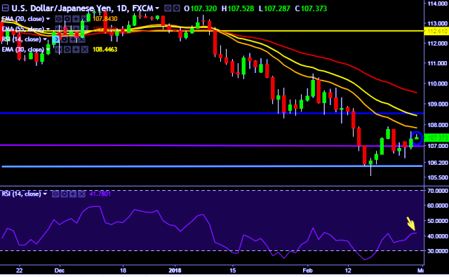 - It made intraday high at 107.52 and low at 107.28 levels.