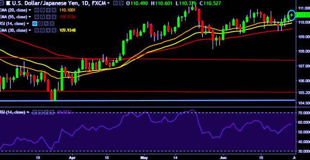 - It made intraday high at 110.60 and low at 110.37 levels.