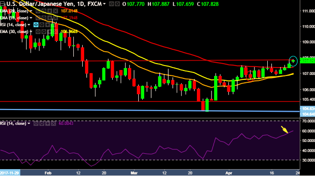 - It made intraday high at 107.88 and low at 107.65 levels.