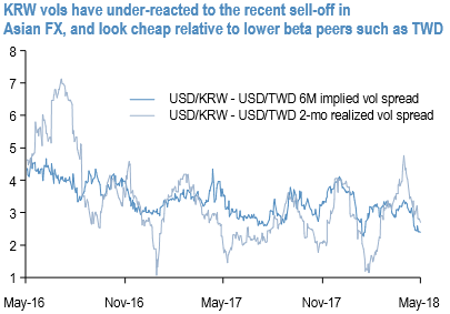 It is also true that sizeable net equity outflows from the Korean equity market in 1Q’18 may have left the won less vulnerable to Q2’s 5% SPX drawdown. Still, it is odd for implied vols in a high-beta currency like KRW to decouple so starkly from the regional trend at a time when the flowing backdrop is similar in equity-sensitive sensitive peers like TWD, and considering upcoming trade-related event risks in the form of additional US tariff and tech / IP related announcements later in the month that can have ramifications for the entire North Asian tech supply chain.