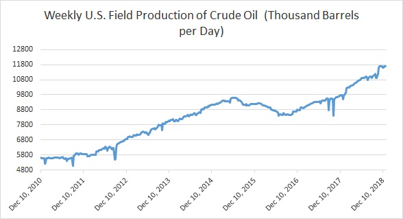 - Chart 1 shows crude oil production in the United States at a record high of 11.7 million barrels per day. Last week, there was no change.