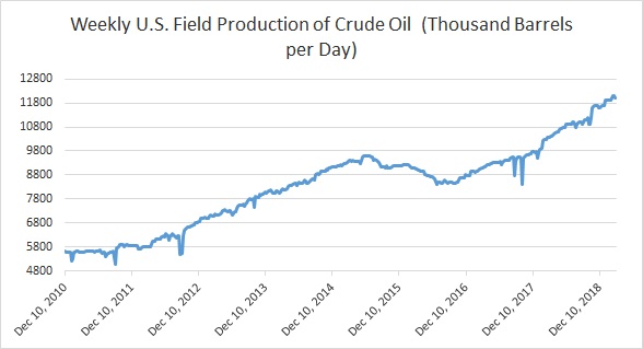 - Chart 1 shows crude oil production in the United States at 12 million barrels per day, which slipped from a record high of 12.1 million barrels per day.