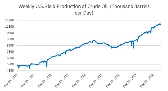 - Chart 1 shows crude oil production in the United States reached a new record high of 12.3 million barrels per day last month. Last week, it again rose to 12.3 million barrels per day.