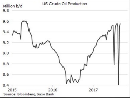 - Chart 1 shows crude oil production in the United States which rebounded sharply from 8.41 million barrels per day to 9.55 million barrels per day as the Hurricane effect fades.
