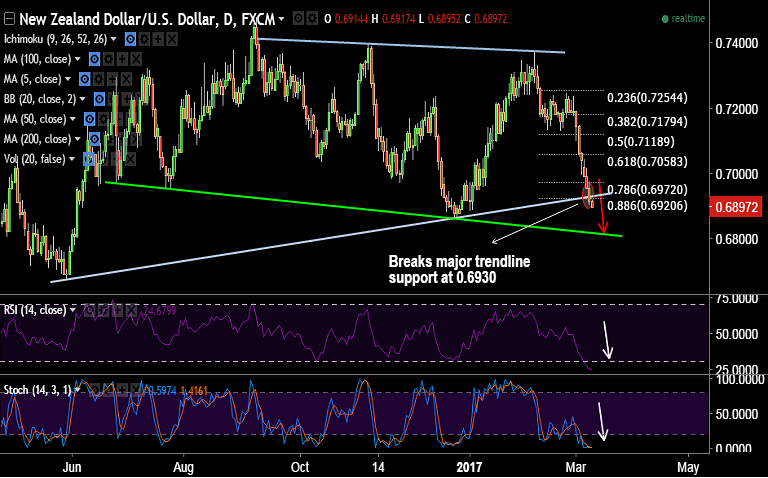 - NZD/USD has continued in the downtrend for 7th consecutive session, has hit fresh 2-month lows at 0.6892.