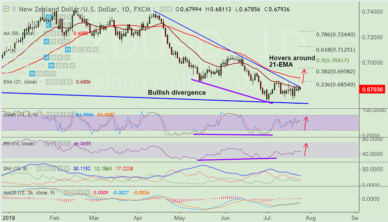 Resistance levels - 0.6810 (nearly converged 21-EMA and trendline), 0.6855 (23.6% Fib), 0.6880 (50-DMA)
