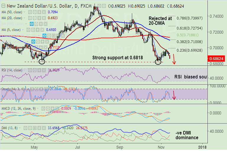- NZD/USD hits fresh weekly lows near 0.6860, bias lower.