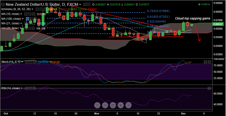 - The pair's inability to hold above the daily cloud top also highlights downside, we recommend going short on rallies around 0.6680, SL: 0.6730, TP: 06580