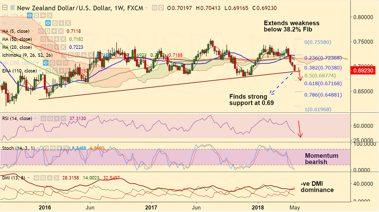 - The major is extending weakness for 4th straight week, eyes major trendline support at 0.69 levels.