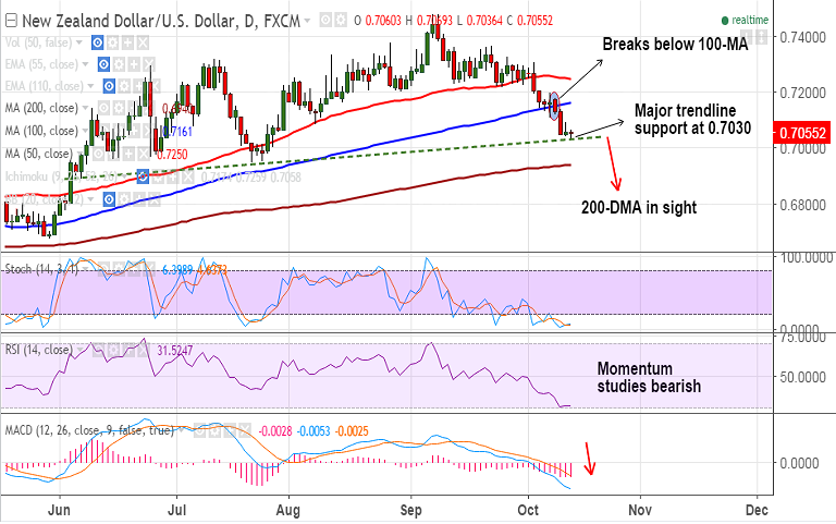 - The pair is holding major trendline support at 0.7030, break below could drag the pair lower.
