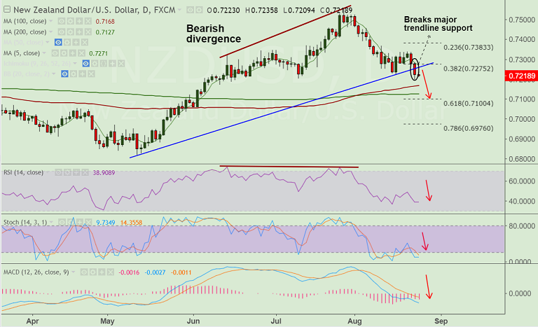 - NZD/USD is extending downside after break below major trendline support at 0.7250 on Wednesday.