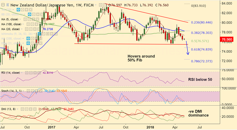 Resistance levels - 76.65 (5-DMA), 77, 77.22 (21-EMA)