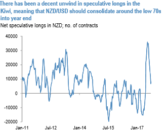 We continue to look for a lower NZD over the coming year, as tight financial conditions, weaker growth, a housing market that has peaked and a policy rate more likely to go down than up in the next year all weigh on the Kiwi. A combination of weaker data and uncertainty ahead of the general election has driven a decent position adjustment in NZD of late (refer above chart), so our 4Q’17 target of USD0.70 is only 1.8c below current levels.