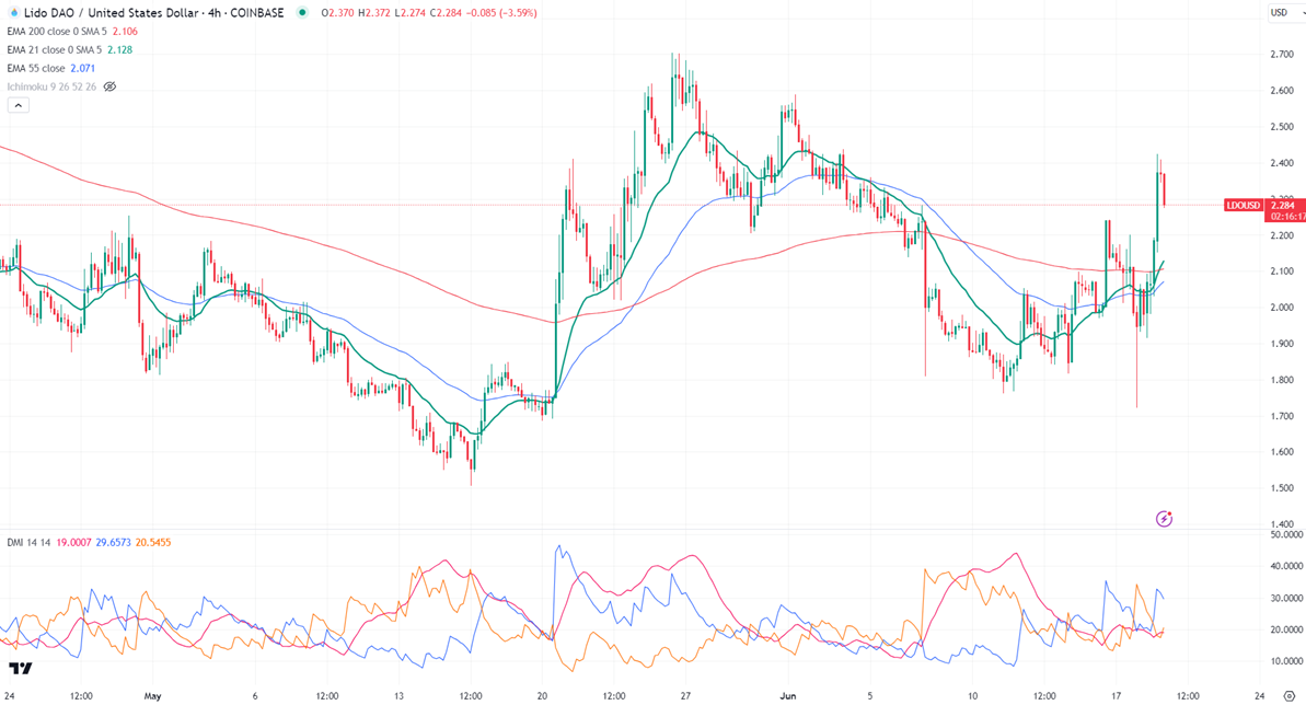 LDOUSD jumped more than 40% in the past two days. The pair holds well above the short-term (21 and 55 EMA) and long-term moving average. It hit a high of $2.424 and is currently trading around $2.272.