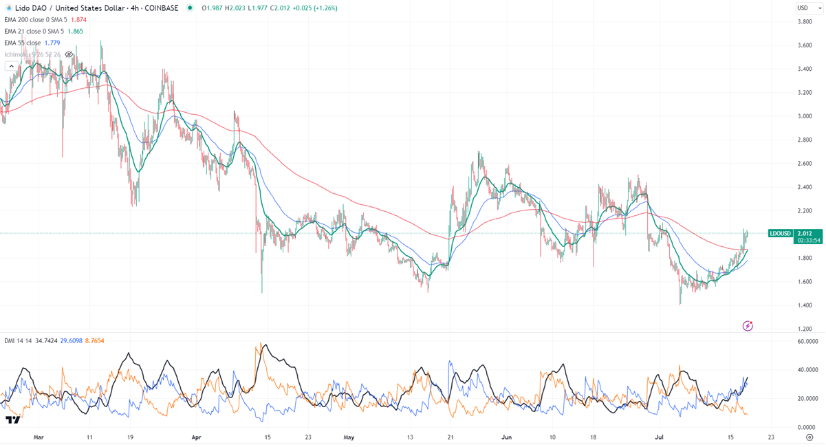 LDOUSD jumped more than 45% in the past two weeks. The pair holds well above the short-term (21 and 55 EMA) and long-term moving average. It hit a high of $2.047 and is currently trading around $2.