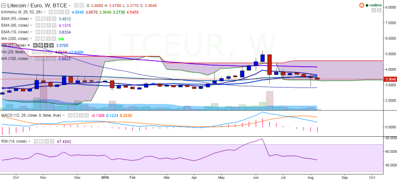 LTC/EUR is seen trading below on Friday. The pair has recovered sharply from the low of 2.90 in the previous week (BTCE). It is currently trading around 3.36 at the time of writing.