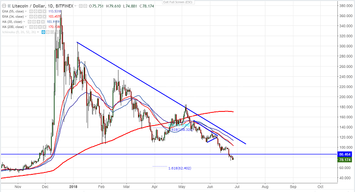 - LTC/USD has shown a minor jump till $79.61 from yesterday low of $74.88. The pair has formd minor top around $103.85 and any further bullishness only above that level.. The pair declined more than 60% from the temporary top $182.35. It is currently trading around $80.95.It has declined almost 79% from the all-time high of $370.