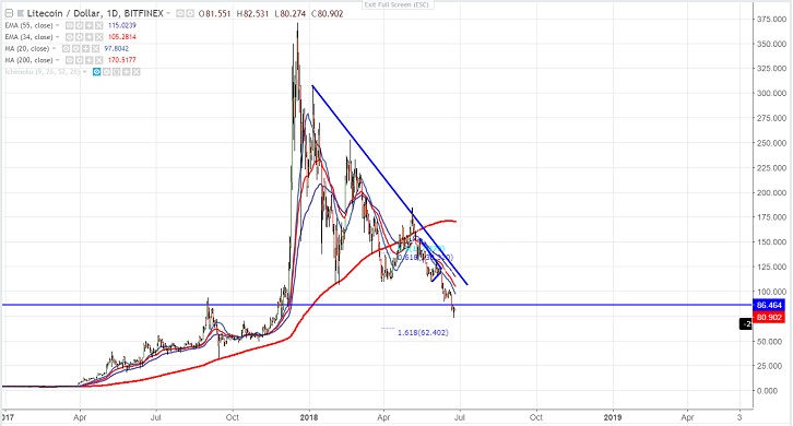 - LTC/USD has shown a minor jump till $84.50 from the low of $73.35. The pair has formd minor top around $103.85 and any further bullishness only above that level.. The pair declined more than 60% from the temporary top $182.35. It is currently trading around $80.95.It has declined almost 79% from the all-time high of $370.