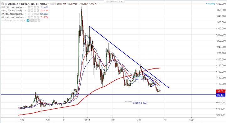 - LTC/USD has shown a minor jump after hitting low of $89.25. The pair declined more than 50% from the temporary top $182.35. It is currently trading around $95.75. It has declined more than $20 in previous week. It has declined almost 79% from the all-time high of $370.