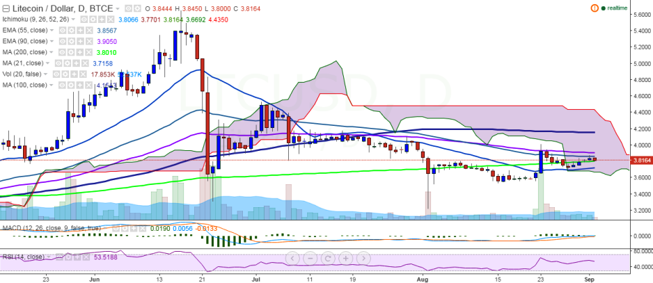 LTC/USD traded in the red on Friday and is facing resistance from 55 EMA. It is currently trading at 3.81 levels at the time of writing (BTC-e).