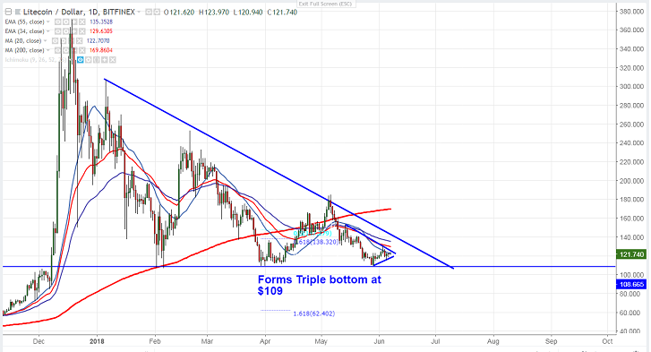 - LTC/USD is showing minor jump after hitting low of $115.70. The pair hits intraday high of $123.97 and is currently trading around $121.63. It has shown a jump of $20 in previous week. The pair has declined almost 70% from the all-time high of $370.